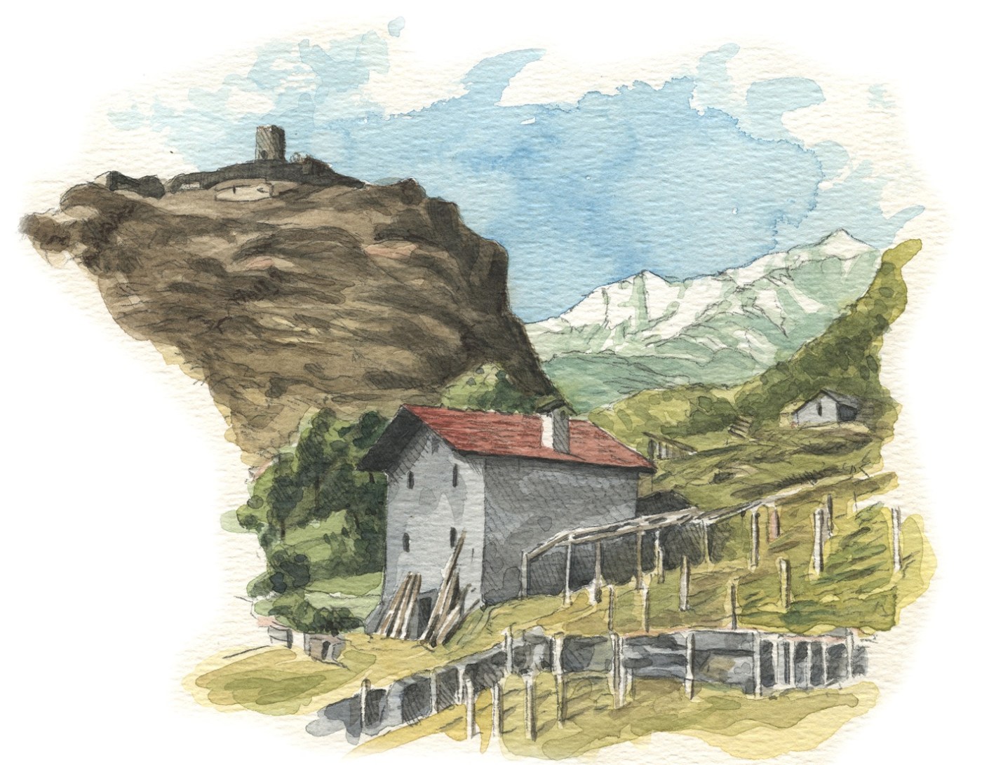 Si lascia l’auto al parcheggio di Toffo e si entra a piedi nel villaggio. Negli slarghi, fra le case, belle e antiche vasche d’acqua. Sugli edifici appaiono date e iscrizioni incise. Si esce dalla parte nord, già lungo il tracciato della via romana. Il versante, ben esposto al sole e chiamato localmente ‘adret’, permette la viticultura. Infinite linee di terrazzi si sovrappongono l’una all’altra. La visuale si apre sulle numerose frazioni di Montjovet, sparse sul versante a differenti altezze.Si passa accanto a una cappellina che rievoca le processioni religiose un tempo effettuate a protezione delle vigne e dei campi. Quindi si calca il sedime della strada romana, restaurato nel 1994 per opera dell’Associazione Alp Action. Si notano i solchi dei carri, la pavimentazione su roccia, i muri che sostengono a valle la carreggiata. Si raggiunge Barmas, le cui case si proteggono sotto un costone di rocca, la ‘barma’ appunto. Ora si procede lungo la strada asfaltata: sulla sinistra, nella vegetazione, s’intravedono le spalle di un ponte romano. Serviva alla strada della Gallie per superare il torrente Bussolinaz. Ora si sale alla stretta fra il versante di valle e lo sprone del castello di St-Germain. Alle case di Provaney si piega a sinistra raggiungendo in breve la chiesa di St-Germain, edificio della fine del XVII sec. ma con campanile del XV.Un sentiero vince ora l’ultimo balzo di quota sulla scabra rupe del castello. Fin dall’antichità questo punto era considerato strategico per il controllo della valle, fra le conche di Verrès e di St. Vincent. Del castello, smantellato dai Savoia nel 1661, restano i forti recinti murari, una torre e le fondazioni di vari edifici che fanno pensare a un vero insediamento abitato.