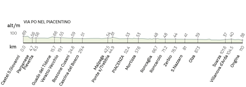 Punto di partenza: stazione Fs di Castel San Giovanni sulla linea Piacenza-Voghera; Punto di arrivo: Ongina, frazione del comune di Busseto (PR)