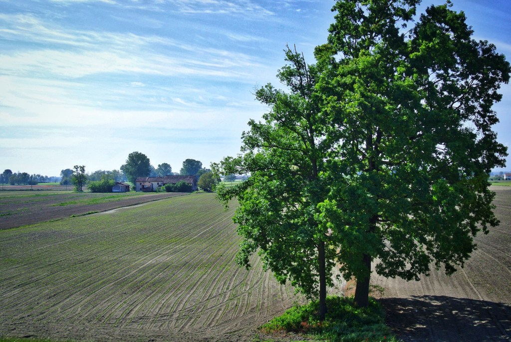 Il Po, nel suo tratto mediano, fra Emilia e Lombardia, si abbandona alla lentezza. Il suo grande corpo d’acqua divaga nella Pianura Padana senza fretta. Si distende, si allarga, si ramifica, compie dei larghi giri, accetta con disinteresse gli apporti dei suoi affluenti, più corposi e costanti quelli di sinistra che scendono dalle Alpi, più capricciosi e saltuari quelli di destra che arrivano dall’Appennino. Le anse del fiume sembrano le ‘elle’ o le ‘effe’ di una largheggiante calligrafia scolastica. A rincorrerle in bicicletta sugli argini c’è da compiere chilometri senza spostarsi di molto nella direzione normale del fiume, da occidente a oriente. Però è bello perché si tratta di pedalare a un passo dal cielo, rialzati di quel tanto che l’argine permette e che consente di vedere più lontano: i riquadri delle campagne, le partiture dei pioppeti, il miscuglio dei boschi di ripa, le isolate cascine, i campanili e le strade diritte, il lontano fondale delle montagne che cingono la pianura. Dicono poi che sulle scarpate degli argini ci sono fiori sfuggiti ai diserbanti che qui hanno trovato rifugio e protezione. Per questo sugli argini ci sono farfalle e anche api intente nella loro instancabile raccolta. Per questo è piacevole rincorrersi pedalando anche se i rettifili sembrano infiniti e il vento, a volte, ostile.