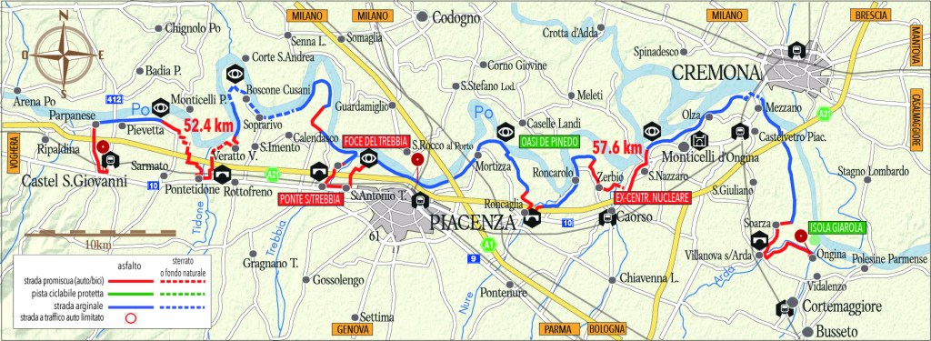 Condizioni d’uso. In prevalenza strada arginale (argine maestro di destra Po) della larghezza media di 3-4 metri, asfaltata (92.8%) o sterrata (7.2%) con limitazione di traffico veicolare; qualche tratto di strada promiscua a Piacenza e negli altri centri abitati. Sull’argine maestro del Po, a oriente di Piacenza, il transito dei veicoli a motore è precluso da marzo a metà ottobre nei giorni di sabato e domenica. Segnaletica. Cartelli ‘Via Po’ abbastanza frequenti, un po’ stinti, in alcuni casi fuorvianti quando suggeriscono varianti di percorso. Sicurezza. Rare le intersezioni con la viabilità ordinaria, per lo più nei centri abitati, ma pericoloso il tratto di 500 metri lungo il ponte sul Trebbia (S.S.10). Dislivello. Insensibile. Altezza massima: 69 metri a Castel San Giovanni (partenza). Altezza minima: 38 metri a Ongina (arrivo) Mezzo consigliato: bici da turismo, mountain-bike, gravel, e-bike. Le osservazioni naturalistiche richiedono pazienza e buone condizioni ambientali, ma portare con sé un binocolo può favorire qualche incontro ravvicinato con le molte specie di uccelli che frequentano le zone più recondite della golena del Po.