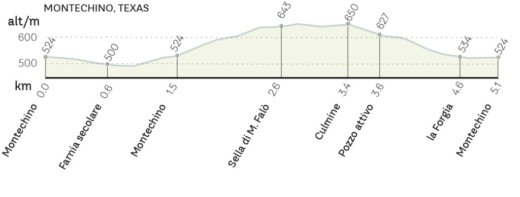 1. Si prende avvio dalla poche case di Montechino (alt. 524), nel crocicchio dov’è il monumento a ricordo di Ettore Rosso, medaglia d’oro della Resistenza. I pozzi furono di grande interesse strategico durante la guerra, sia per i tedeschi sia per la Repubblica sociale, e quindi un obiettivo primario per la Resistenza. Conteso tra partigiani e fascisti, Montechino fu teatro di aspri scontri fino agli ultimi giorni del conflitto. Il movimento partigiano si era sviluppato grazie alle precedenti conquiste degli operai dei cantieri petroliferi e dei contadini, i quali fin dal 1921 si erano coraggiosamente opposti alla violenza squadrista tanto da annoverare Montechino fra i centri più avanzati delle lotte sindacali nel Piacentino.