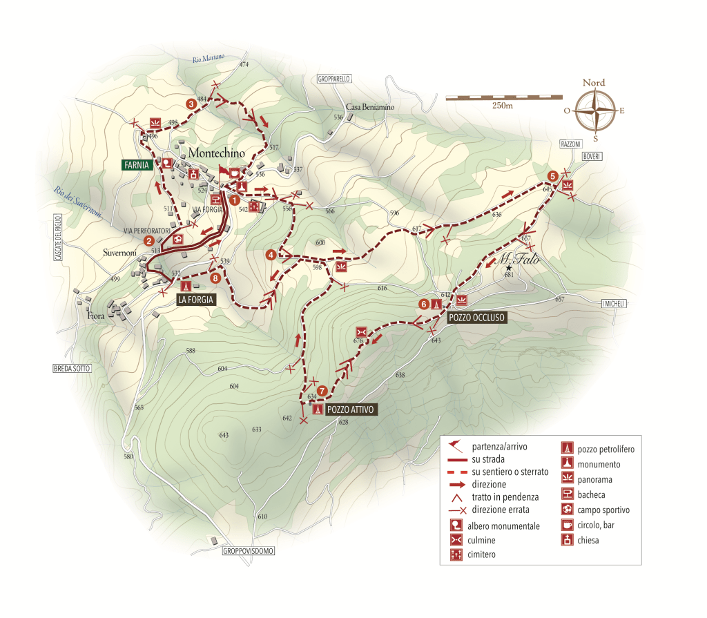 8. In fondo si arriva ad un’area prativa che ospitava la Forgia, ovvero le officine destinate alla produzione delle tubazioni per lo stoccaggio del petrolio. Si esce dall’area in fondo, a sinistra, dove si trova una riproduzione in legno di una torre di perforazione. Si attraversa la strada provinciale e si scende dalla parte opposta (Via Suvernoni) raggiungendo velocemente il campo sportivo e il centro di Montechino.
