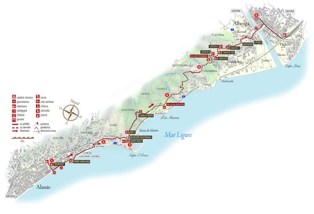 Alassio e Albenga sono separate da un tratto di scogliera che prospetta sul mare e sulla vicina Isola Gallinaria. La Via Aurelia corre quasi all’altezza del mare, mentre l’originaria strada consolare romana, utilizzata fino all’inizio dell’Ottocento, si snoda poco più in alto. La si può seguire fedelmente, benché la pavimentazione originaria sia ormai perduta (ne resta un solo tratto di poche decine di metri). Si possono però osservare i notevoli reperti di tombe, edifici e altri monumenti che varie campagne archeologiche hanno riesumato lungo o nei pressi della strada.