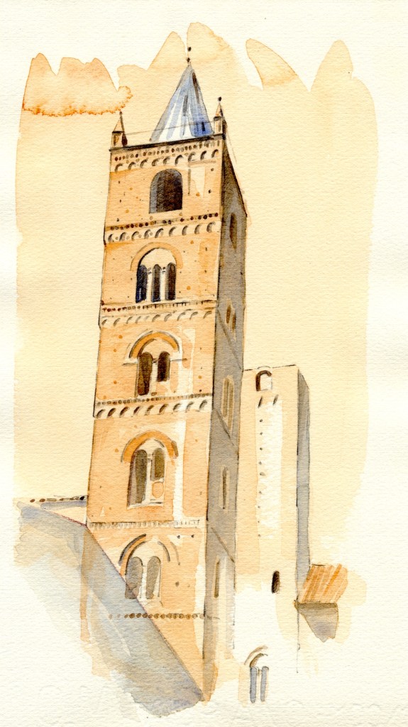 Piazza S.Michele e la viuzza fra il Battistero e la Cattedrale sono il cuore monumentale della città e limiteremo a ciò la nostra descrizione. Innanzitutto volgendo lo sguardo alle tre alte torri che rivaleggiano fra loro in possanza e altezza: la Torre del Municipio, più rozza e apparentemente più antica, ma la trifora sul lato nord la apparenta con il vicino edificio, della seconda metà del XIII sec.; la Torre Comunale, col Campanone e l’orologio, che rivela nel duplice gusto delle aperture tonde e ogivali la transizione fra romanico e gotico (le si accosta il Palazzo Vecchio del Comune, sede del Museo Ingauno); infine, il campanile della Cattedrale, risalente al 1395, dalla base romanica, coeva alla chiesa, e l’alzato in laterizio con sei piani di bifore e trifore inghirlandate a festa dalle cornici di archetti pensili e dalla cuspide in maiolica.
