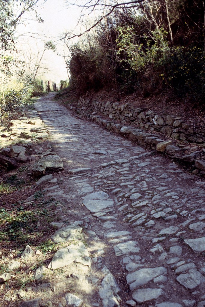 A un tratto si affianca la chiesuola di Sant’Anna ai Monti (alt 90), pure dipendenza della Gallinaria, con annesso un piccolo romitorio (all’interno, non visitabile, notevoli affreschi della fine del XV sec.). Più avanti la strada si divide: si segue il braccio di destra (Via Julia Augusta) che ci conferma la vetustà del percorso. Finalmente si lascia l’asfalto per lo sterrato. In lontananza si configura la piana di Albenga, disseminata di serre e vivai. Il cammino si fa più solitario, aggirando poggi con ulivi e qualche improvvida recinzione. A un’altra biforcazione si imbocca la traccia di sinistra (vicino c’è uno stinto cartello che indica la strada romana) e si giunge al cospetto di un brano originario di selciato antico.